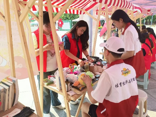 公司志愿者细心的讲解和热情的服务,让每位顾客都选到了自己心仪的物品并加以称赞,让物有所需、物有所值,也展现了经院体育人的风采。