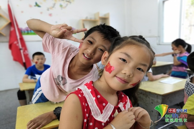 图为员工们在脸上贴上小国旗来支持我们此次的活动,同时表达对祖国的热爱。中国青年网通讯员 姚祥锦 摄