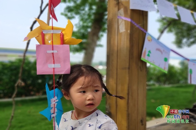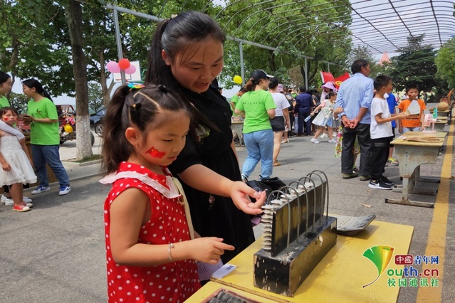 图为村民带领自己的孩子来参观博览会,孩子对其他孩子的手工品和图画展现出浓厚的兴趣。此图是抓拍出孩子望向教室的图片。中国青年网通讯网 陈沙沙 摄