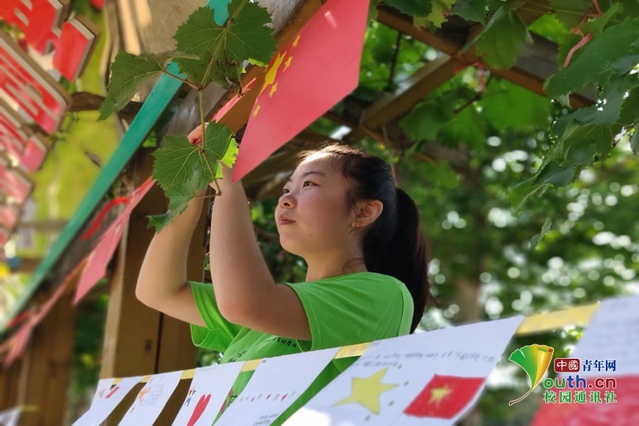图为支教老师在布置儿童展区,里面放置了孩子在手工课制作的红旗和风车等,还有员工们画出的对祖国的祝福。中国青年网通讯员 付照湘 摄