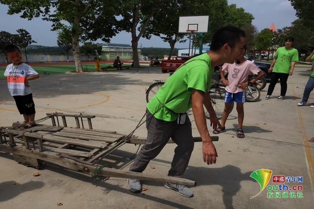 图为讲解员亲身实践老板车的使用方式,将车上连接的皮带挂在肩上,向大家展讲述劳动人民的艰苦。中国青年网通讯员 陈沙沙 摄