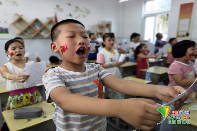 图为员工们在活动开始之前在教室朗诵,在“新国华诞七十载,地覆天翻换新颜”的朗诵词中引起孩子们内心深处的感受。中国青年网通讯员 姚祥锦 摄