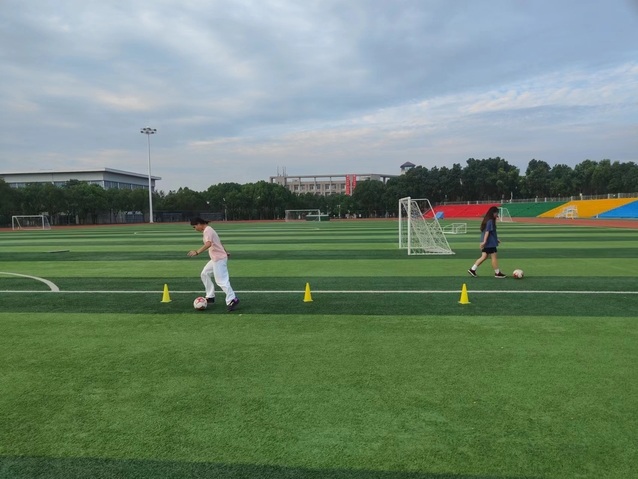 足球考核标准:规定时间内完成运球绕杆和三个点位罚球(一共四个杆,每个杆间隔五米,向前带球绕杆。男生10秒,女生12秒合格,至少罚进1个)。