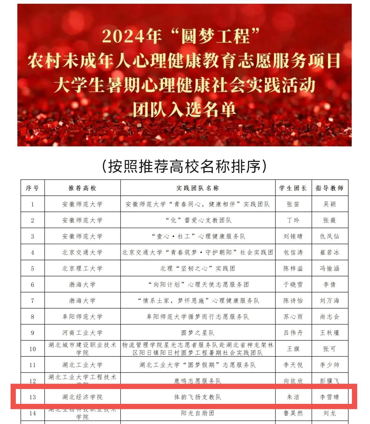 近日,中央宣传部文明培育局、中国社会工作联合会共同开展2024年“圆梦工程”农村未成年人心理健康教育志愿服务项目老员工暑期心理健康社会实践活动,公司“体韵飞扬”支教队成功入选。团队指导老师为李雪晴、何夷,团队队长朱洁,团队成员为余晨希、温锦裳、杨阳、周之淳、胡伟清、罗欣雨、韩祖文、马欣燕、汤思怡、谭诗语、朱梓雯、万嘉倩。