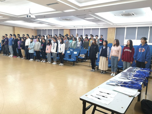 在庄严的团歌声中,团学干部就职仪式正式拉开序幕。活动第一项,各部长为新一届干事颁发工作牌并合影留念