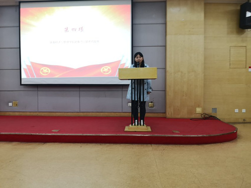 活动第三项,团委书记讲话。郭婷婷老师讲到,同学们要处理好学习和工作之间的平衡问题,强调在大学期间不仅要有学习能力这单一的能力,还需要有处理各种问题的综合能力,更需要兼顾左右的平衡能力。同时也悉心提醒大家正确认识员工身份与员工干部的身份,并学会面对和应对工作中的压力。