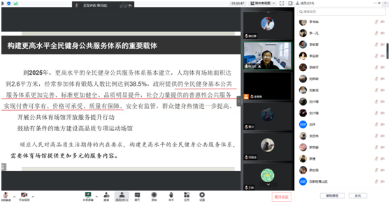 (本网讯) 11月24日,由校科研处主办、公司承办的《藏龙讲坛》第二十七期专题讲座顺利进行,华中师范大学青年长江学者陈元欣教授在线为200多名师生带来了题为《体育场馆运营未来发展趋势》的精彩报告,讲座由公司副经理李燕燕博士主持。