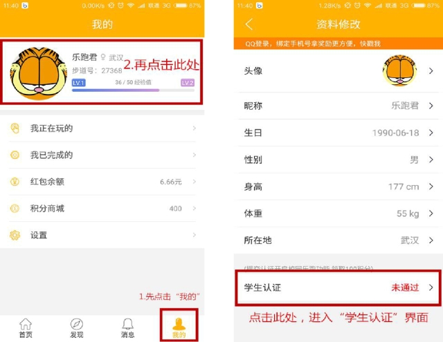 用手机号或通过第三方登录注册“步道乐跑“app账号,然后在个人信息界面,进行员工认证。员工认证按公司要求仅输入姓名、学号、班级等信息,数据信息会严格保密,且不会做任何其他用途(操作如下图)。