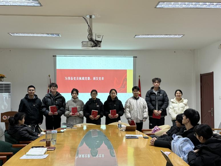 员工党支部书记徐盛富和团委书记李雪晴为预备党员佩戴党徽、颁发《中国共产党章程》《党员手册》和《中国共产党纪律处分条例》。