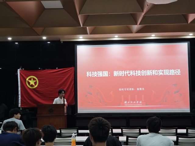 宣讲现场,邬巽昊同学以“科技创新的内涵与分类”为切入点,借助生动的图片与实例,深入浅出地为同学们阐释科技创新的基本概念。结合“中国天眼”等标志性科研成果,讲述科技创新在国家发展中的关键作用,引导同学们深入思考新时代科技创新的实现路径。同时在宣讲过程中还设置了科技问答题环节,充分调动了同学们的积极性,大家踊跃参与、积极抢答,同学们不仅巩固了知识,更对科技创新的理论与实践有了更深刻的理解。