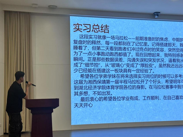 会议伊始,首先上台的是休闲体育2142何耀东同学。他介绍了互通国际文化集团实习点的情况。实习过程中何耀东同学担任马拉松会场助理,负责的马拉松赛事。他根据自己在实习期间所遇到的问题一一分析,提醒低年级的同学要加强理论知识的积累。