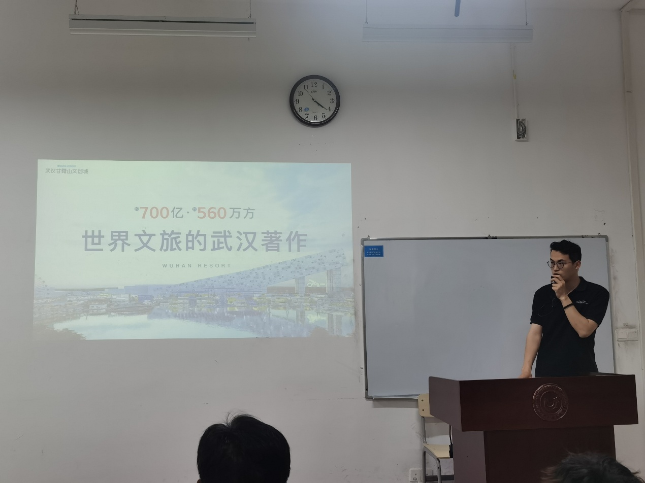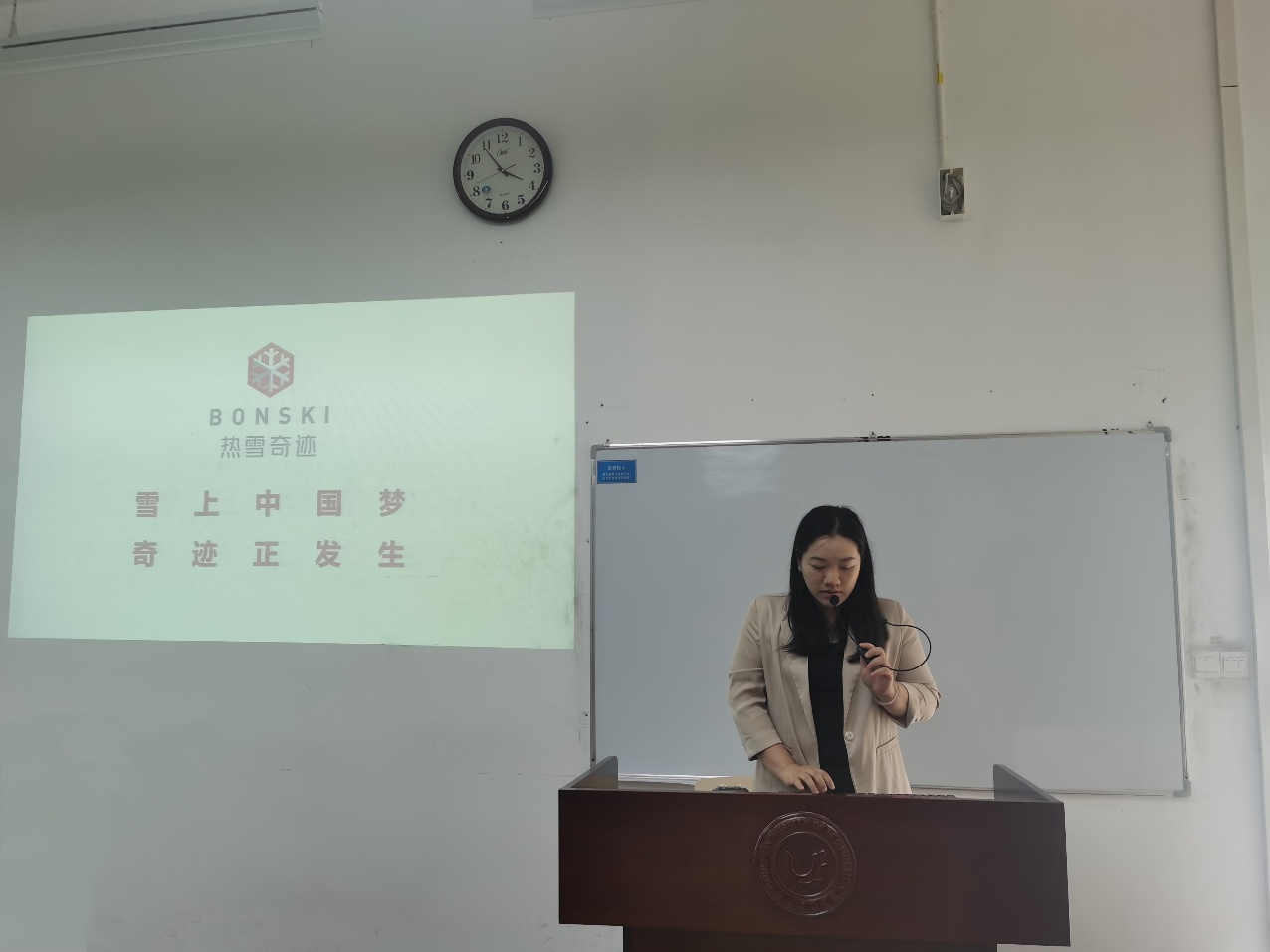随后,位于武汉市黄陂区甘露山文创城内的武汉城建热雪奇迹滑雪场的宣讲人通过PPT展示以及文创城实地拍摄宣传片向同学们展示了该滑雪场的概况、人才培养体系以及招聘条件等。让同学们对在该滑雪场工作的具体环境、实习条件等有了清晰的认识。