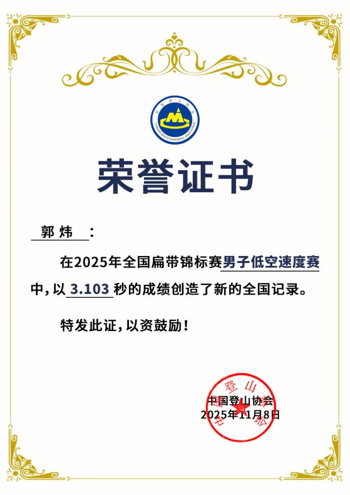 2025年11月9日全国扁带锦标赛在四川彭州圆满落幕。公司扁带队在本次赛事中创下历史最佳战绩 —— 不仅包揽男女子组速度赛冠军,休闲体育 Q2341 班员工郭炜更以 3.103 秒的惊人成绩打破男子组速度赛全国纪录。