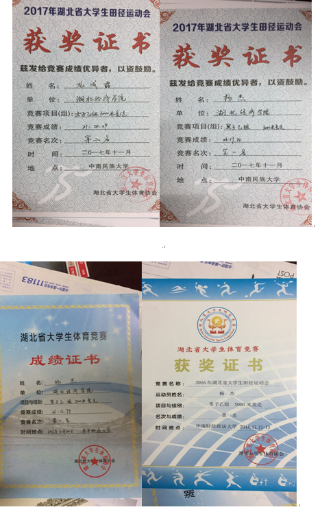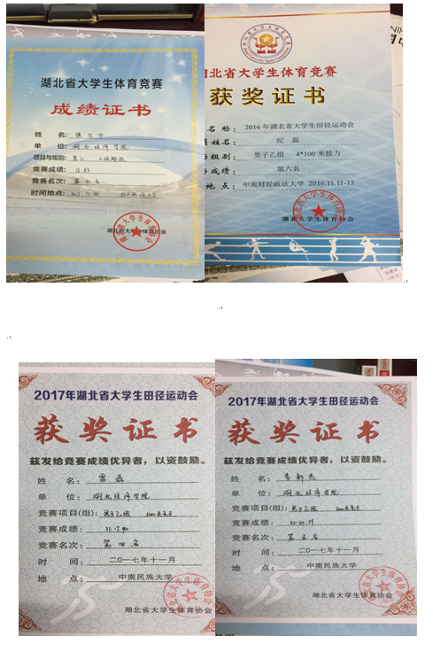 2016年湖北省老员工运动会田径运动会 | 男子乙组:5000米竞走第一名、第二名、第三名;铅球第六名、5000米第三名;4X100米接力第六名;女子乙组:跳高第五名 |