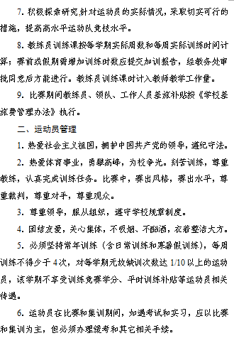 第二条 运动员日常训练按每人每天20元标准给予训练补贴;教练员训练2学时折算1个标准课时,纳入教师教学酬金分配。