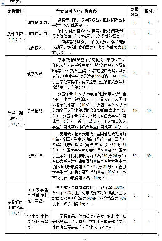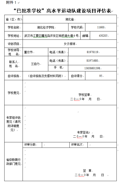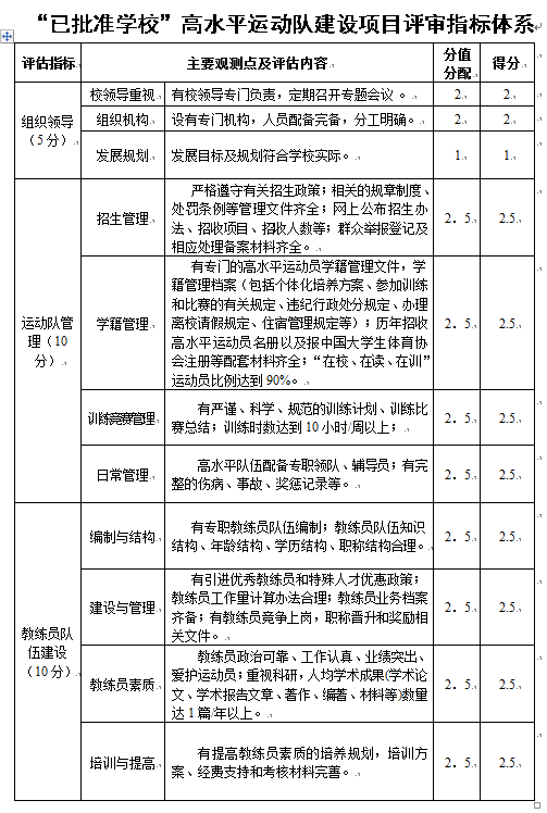 经过八年建设,公司的体育学训练条件得到根本改善,现已成为湖北非体育院校中体育教学条件最好的高校之一。近几年,公司高水平运动队排球项目发展迅速,尤其是与省体育局合作共建排球高水平代表队;公司排球高水平运动员员工王文振、周行两位同学先后入选国家男子排球队;2017年公司女排代表湖北省老员工女子排球队参赛中华人民共和国第十三届员工运动会大学组比赛,并取得了第十二名好成绩。排球运动极大地提高了公司声誉,在高水平运动队建设上探索新机制、创造新特色。根据省教育厅办公室《关于做好2018年全省高水平运动队建设项目调整工作的通知》精神,对应评审指标体系的要求,公司对高水平运动队建设排球项目进行了认真自评,自评总分95分。现报告如下: