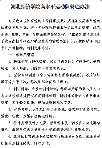 建设与管理 | 有引进优秀教练员和特殊人才优惠政策;教练员工作量计算办法合理;教练员业务档案齐备;有教练员竞争上岗,职称晋升和奖励相关文件。 | 2.5 | 2.5 | |