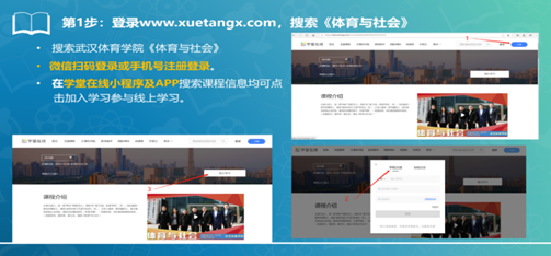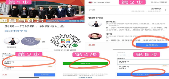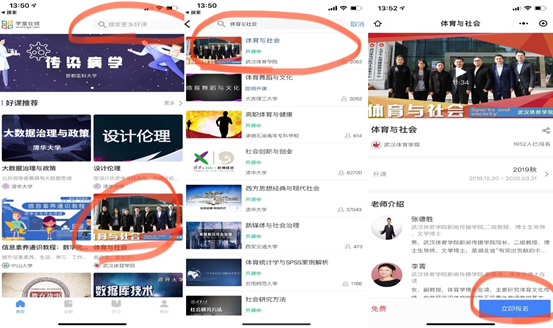 进入学堂在线APP,搜索课程《体育与社会》,点击“立即报名”——“免费学习”(同上)即可开始学习。
