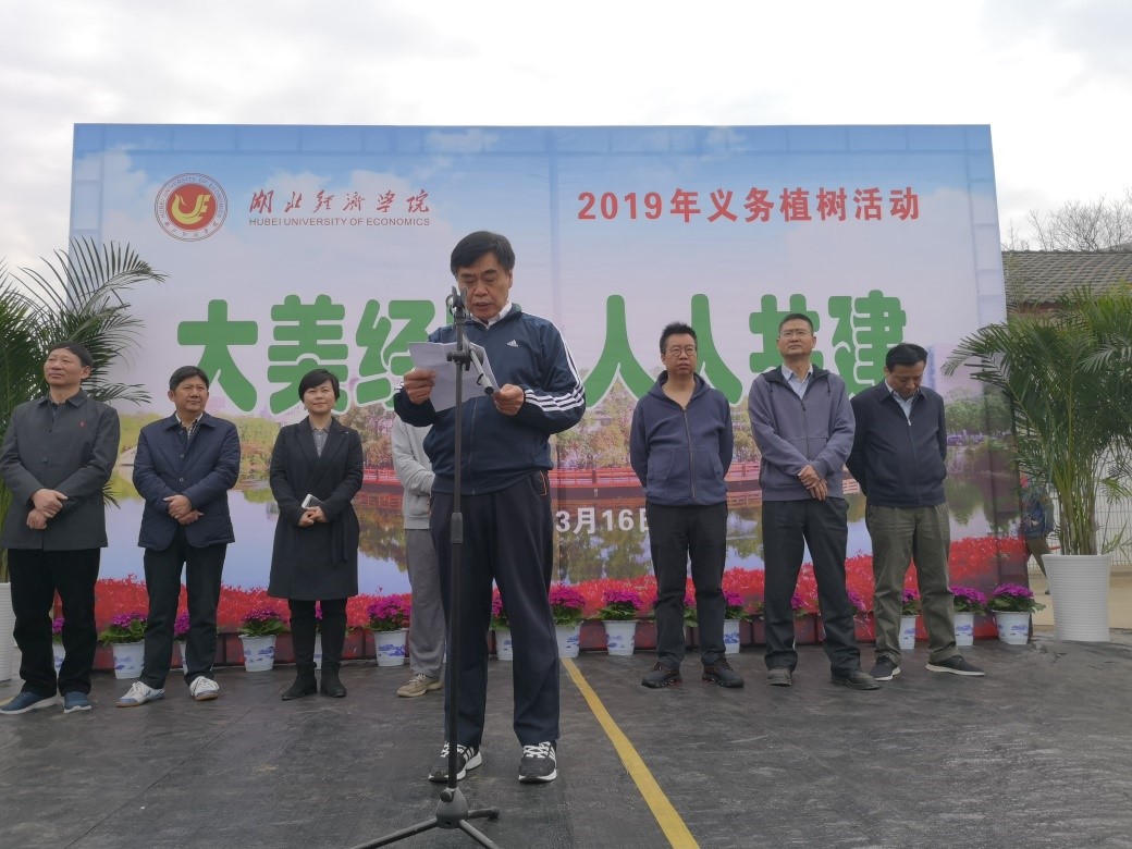 活动第一项,员工代表发言,呼吁大家参与植树活动,携手共创美丽经院。