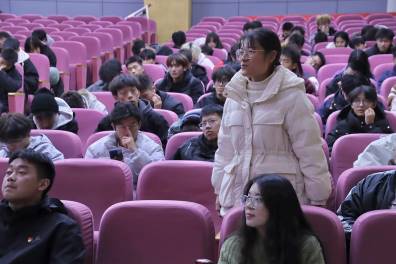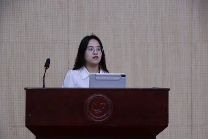 会议第二项,由“经叹号”青年宣讲队成员、税收2141班熊雨桐同学作主题授课宣讲。