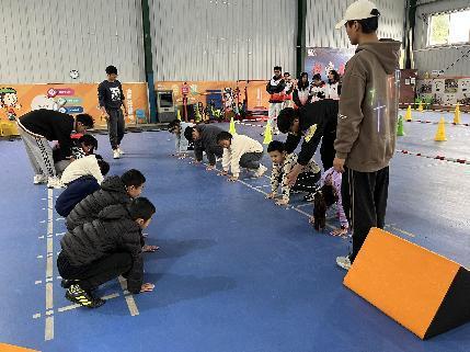 活动伊始,教练员带领学员做热身活动,待学员们活动开身体后,学员们被分为两组,在教练员们的带领下同时开始教学。教练员们教授了金刚跳、撑跨跳、前滚翻、助跑钻栏杆、猫挂等跑酷动作,耐心的给每一位学员进行动作指导以及保护学员安全。
