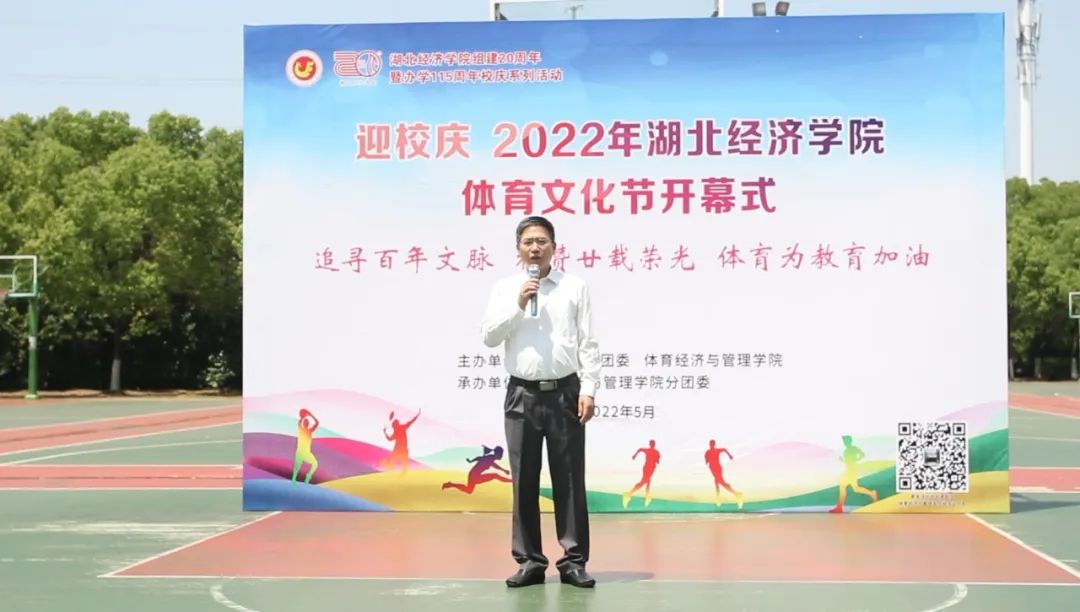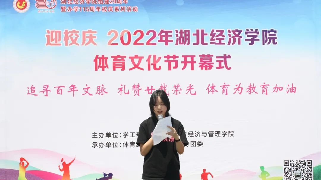 湖北省第34届老员工武术套路锦标赛女子甲组24式太极拳冠军,休闲体育1941班谢纪雅同学作为员工代表在开幕式上发言,她分享了自己的体育故事以及对体育的理解,呼吁同学们能够积极参与到体育文化节系列活动中去,多走下网络、走出宿舍、走向操场,在体育文化节中共同创造良好的经院体育氛围,号召同学们在日后的学习生活中养成体育锻炼的习惯,在体育运动中锻炼身体,磨炼意志,健全人格,以良好的身体素质和昂扬的精神面貌庆祝母校组建20周年办学115周年。