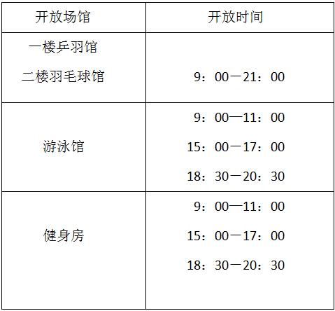 为满足在校师生锻炼身体需要,“五一”期间(4月29日至5月3日)乒羽馆、游泳馆以及健身房正常运营,其中游泳馆、健身房增加上午场。请进馆师生持本人有效健身卡或购票入场,服从工作人员管理。具体时间如下: